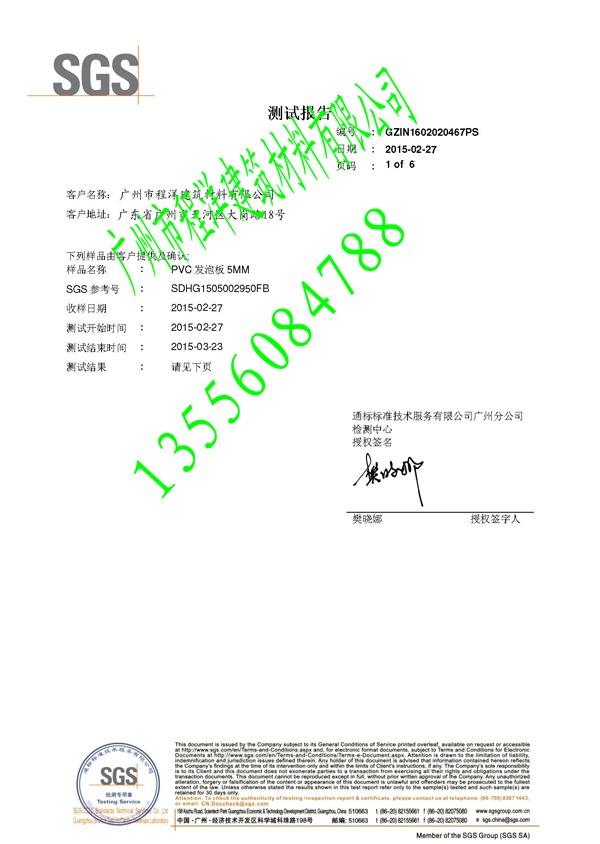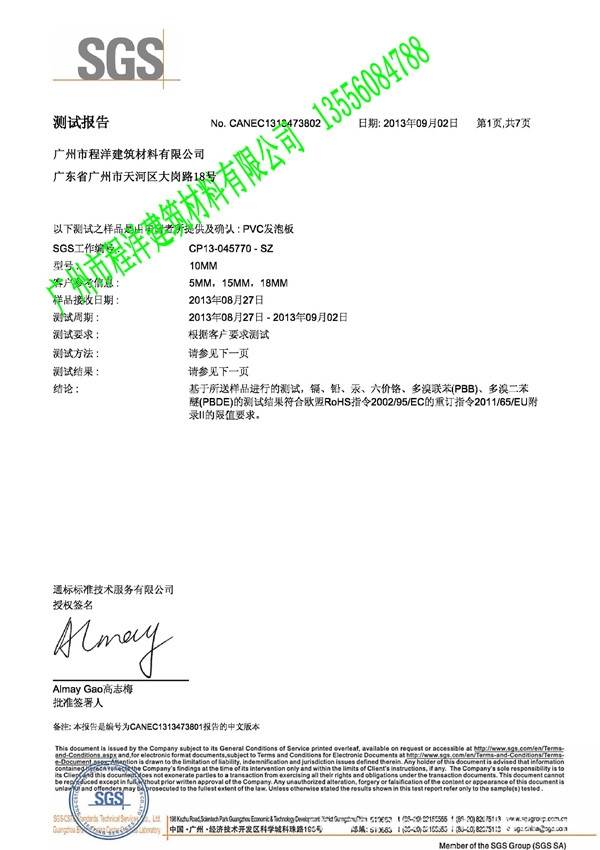 • 程洋PVC共擠發泡板環保出口要求SGS檢測證書