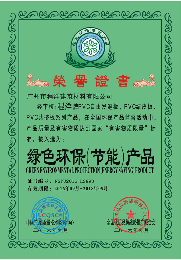 • 程洋pvc發泡板獲得綠色環保節能證書